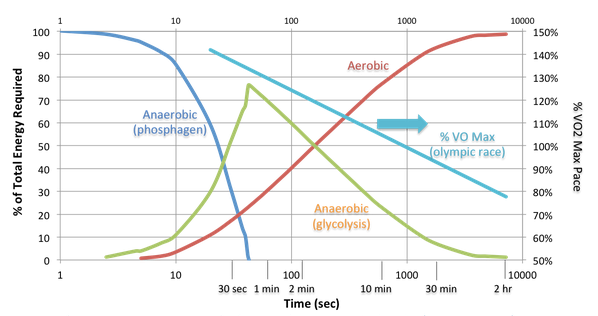 - مسابقات 5-کیلومتر و 10-کیلومتر: سیستم هوازی منبع اصلی انرژی است، با کمکهایی از سیستم گلیکولیز بیهوازی در طول افزایش سرعت یا در شروع مسابقه.