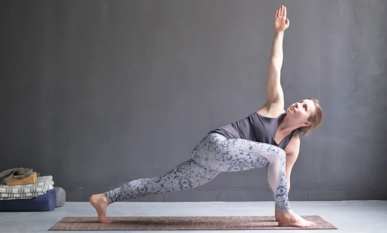 • سپس از ناحیه لگن خم شوید، زانوی چپ را خم کنید و بچرخید تا انگشتان دست راست به انگشتان پای چپ برسند و دست چپ به سمت سقف دراز شود.